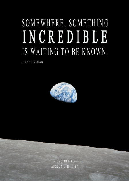 Embark on a journey of discovery with our captivating portrayal of Earthrise, accompanied by the inspiring words of Carl Sagan: “Somewhere, something incredible is waiting to be known.” This breath taking image captures the beauty of our planet as it rises above the lunar horizon, evoking a sense of wonder and possibility.