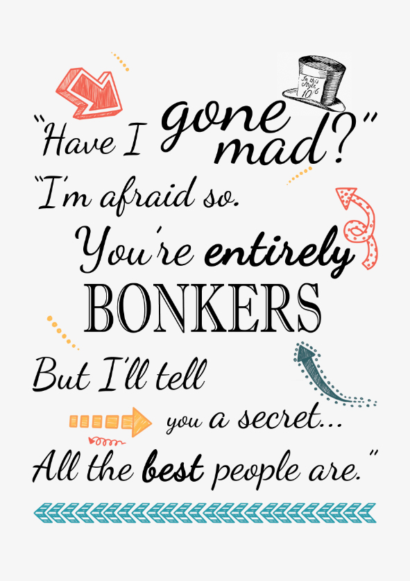 Step into the whimsical world of wonder with this captivating “We Are All Mad Here” print, inspired by the iconic Mad Hatter quote. Set against a backdrop of playful, eye-catching design, this artwork embraces the delightful eccentricity that makes life more interesting. Perfect for those who appreciate the magic of embracing their quirks and the joy of living outside the box, this print is a reminder that a little madness is something to be celebrated.
